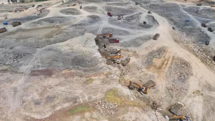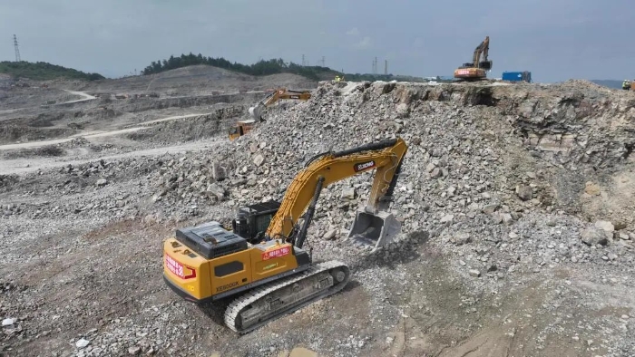 前期爆破剥离工序后,星空官方网页版20吨挖掘机搭配140的小破碎锤进行二破,同时XE380GK、XE600GK等机型进行挖装作业。现场共投入挖掘机50多台,每天的挖方量在10万方左右。