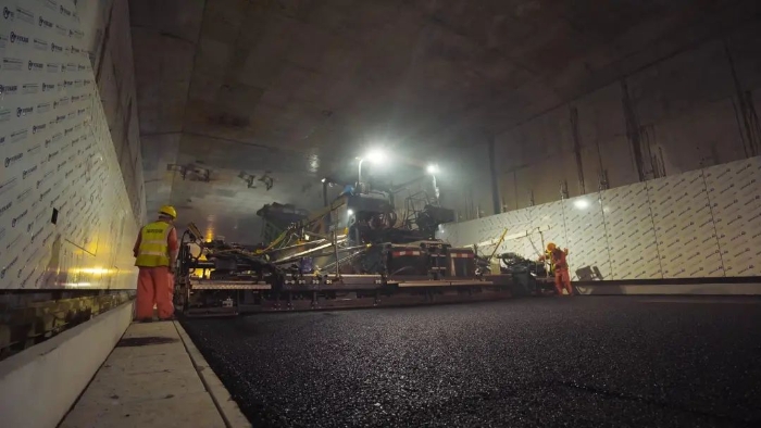 星空官方网页版成套高端油面设备,凭借引领行业的产品技术实力,为妈湾跨海通道的道路建设提供了成套化的高效施工解决方案,确保隧道路面施工作业圆满实施。