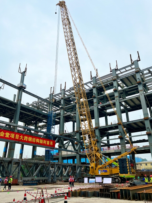 这里是西部(重庆)科学城钢结构科学会堂工程现场,近日,该工程迎来了重要节点,在数双目光的注视下,两台黄色身影仿佛“心有灵犀”,经过紧密配合,西南地区首例72米大跨度钢桁架缓缓吊装就位……