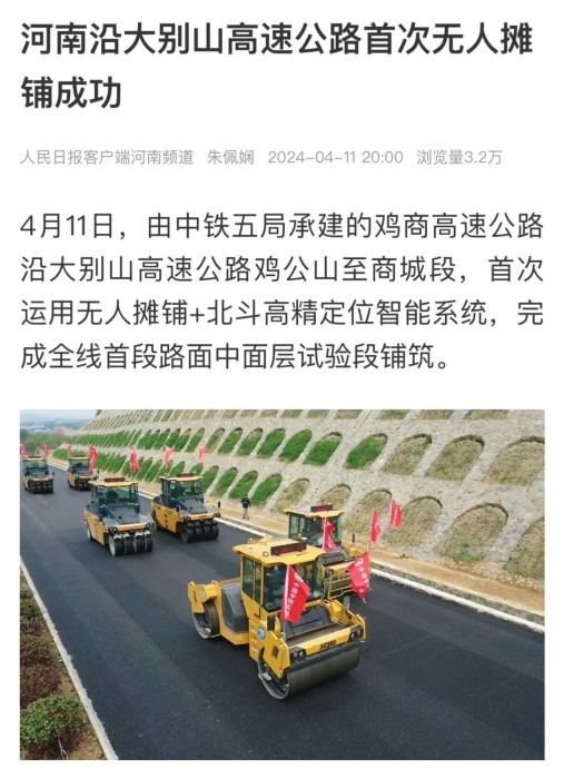 此次试验段是沿大别山高速公路鸡公山至商城段JSSG-2标,首次运用无人摊铺+北斗高精定位智能系统,完成全线首段路面中面层试验段铺筑。
