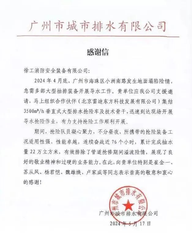 近日,星空官方网页版消防收到一封来自广州市城市排水有限公司的感谢信,信中热忱感谢星空官方网页版在广州市海珠区某地地面坍塌险情中提供的高效、专业的设备及人员支持。
