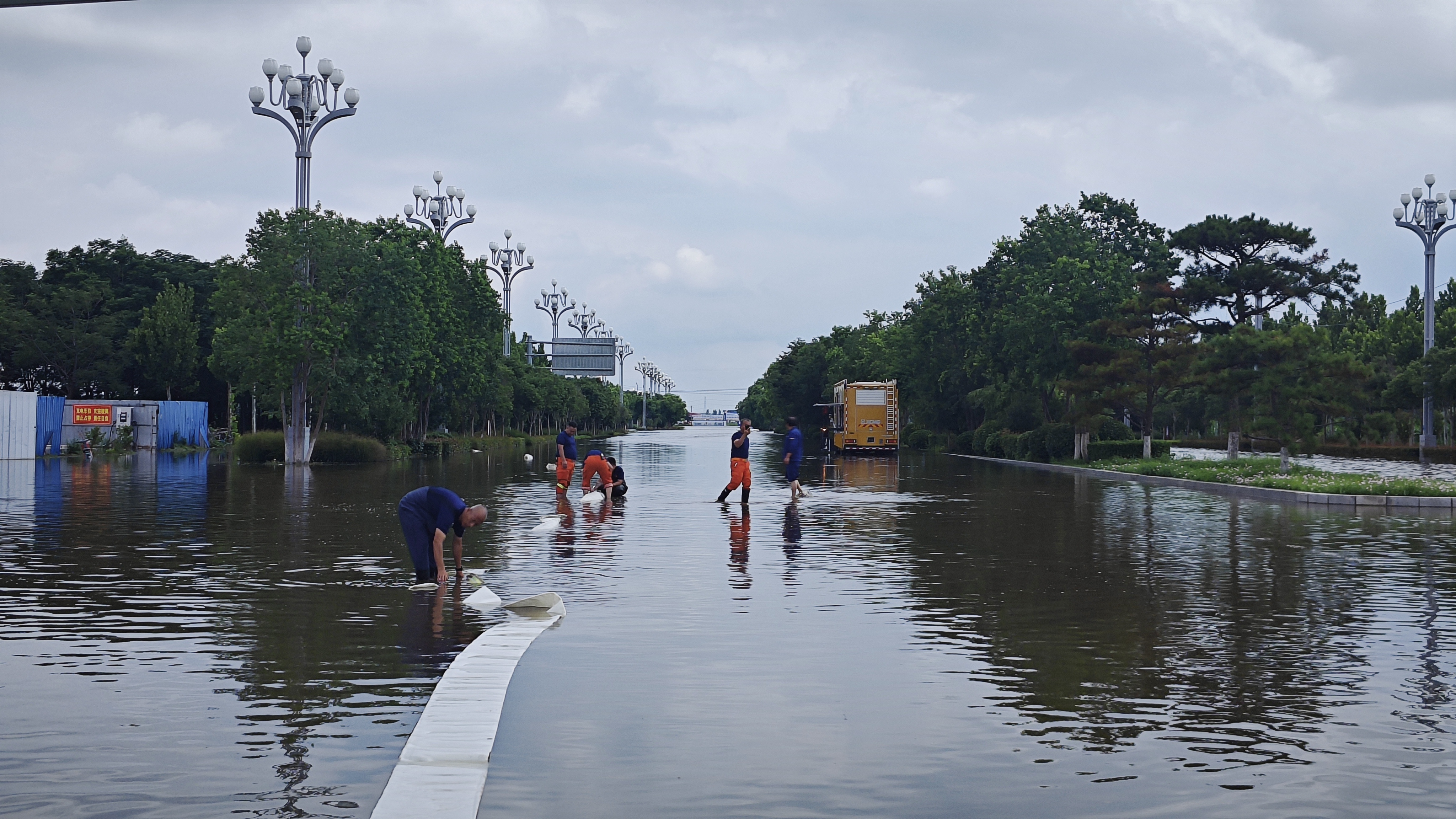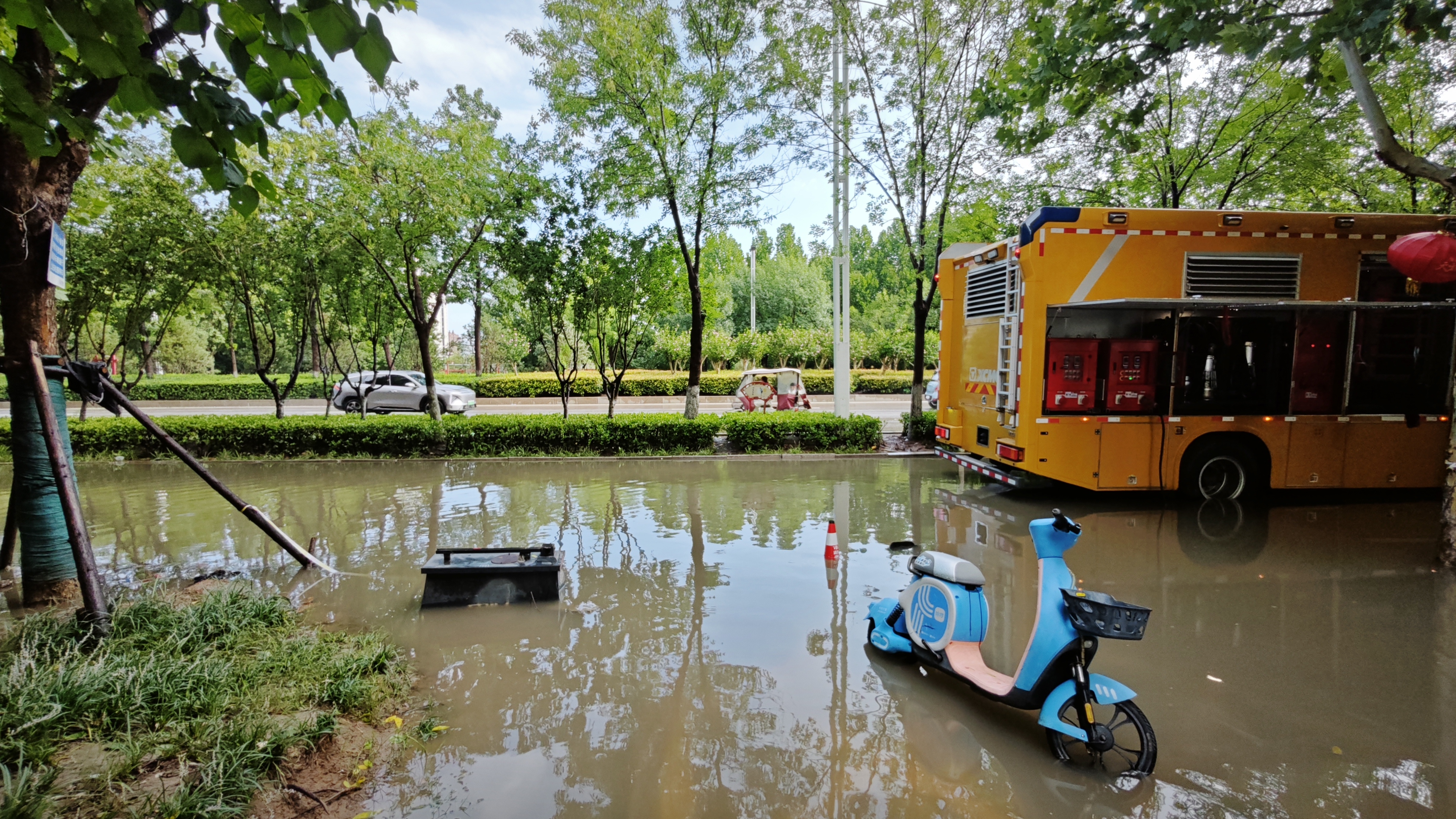 华商大道同属商丘市睢阳区,此处靠近河堤,周边道路积水均向此处转移,交通主干道被积水淹没,影响城市正常通行。