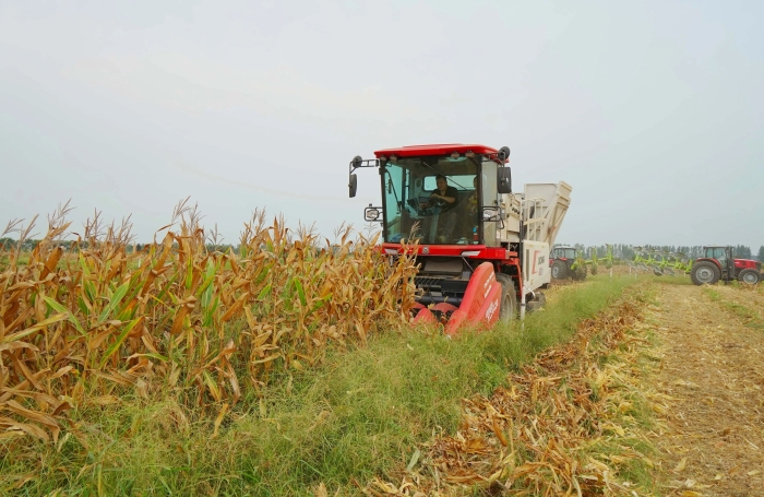 万里晴空之下,XCA420玉米收获机在田间来回穿梭,玉米植株连秆带穗被收入机械中,顷刻间,摘棒、剥皮、秸秆粉碎一气呵成。金黄的玉米果穗从储粮仓倾泻而下,由农用运输车转运至粮仓。