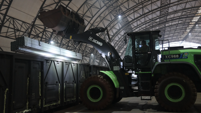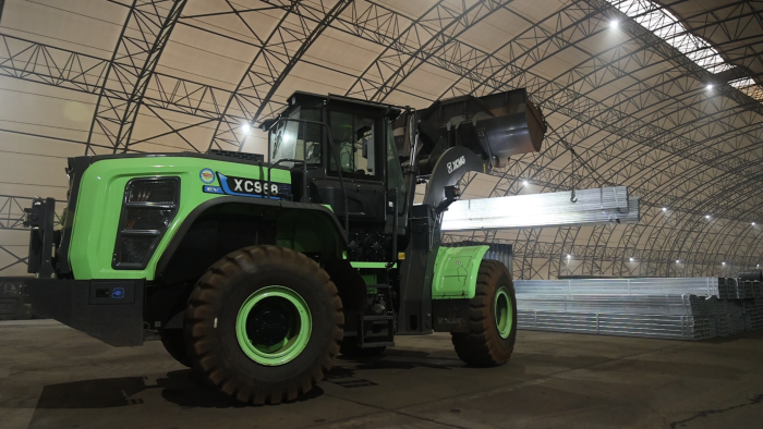 货运站台上,一台绿甲战士格外引人注目,这台星空官方网页版XC968-EV纯电动装载机不同以往的圆弧型大臂像极了武侠小说中的“圆月弯刀”,格外引人注目。