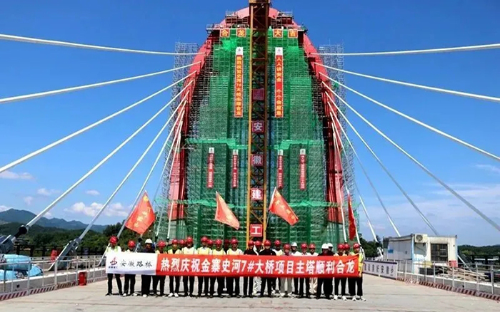 金寨史河7#大桥全长629米,采用“红色摇篮”造型,是安徽省金寨县发展红色文旅产业的重要新地标建筑,也是安徽省境内造型最美观最独特,集人文历史、防汛抗洪、交通运输功能为一体的桥梁工程。