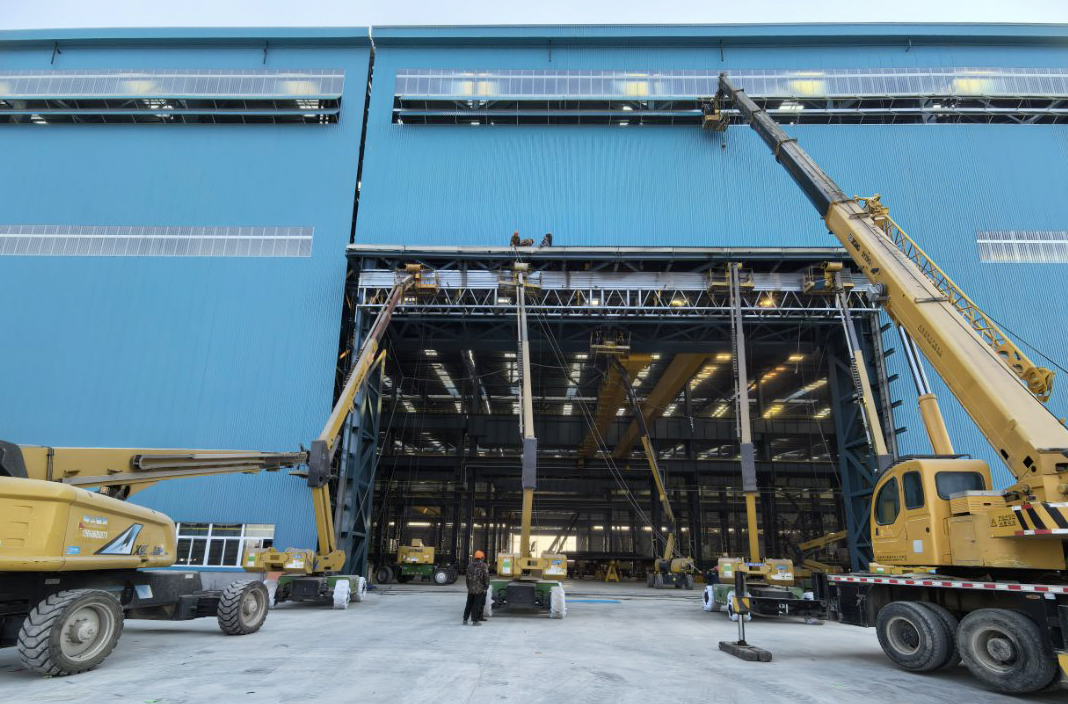 在恒力重工三期厂房建设工地,近10台30米级星空官方网页版高空作业平台正大显身手,忙碌于车间内外钢结构建设与墙面装饰等精细作业。