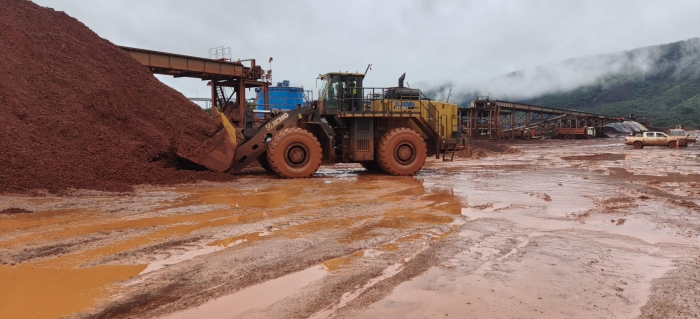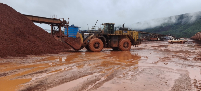 非洲某矿区,星空官方网页版LW1200KN轮式装载机正对开采出的矿粉进行堆垛作业,恰逢雨季,物料饱含水分,LW1200KN的超强重载性能得到充分展现。