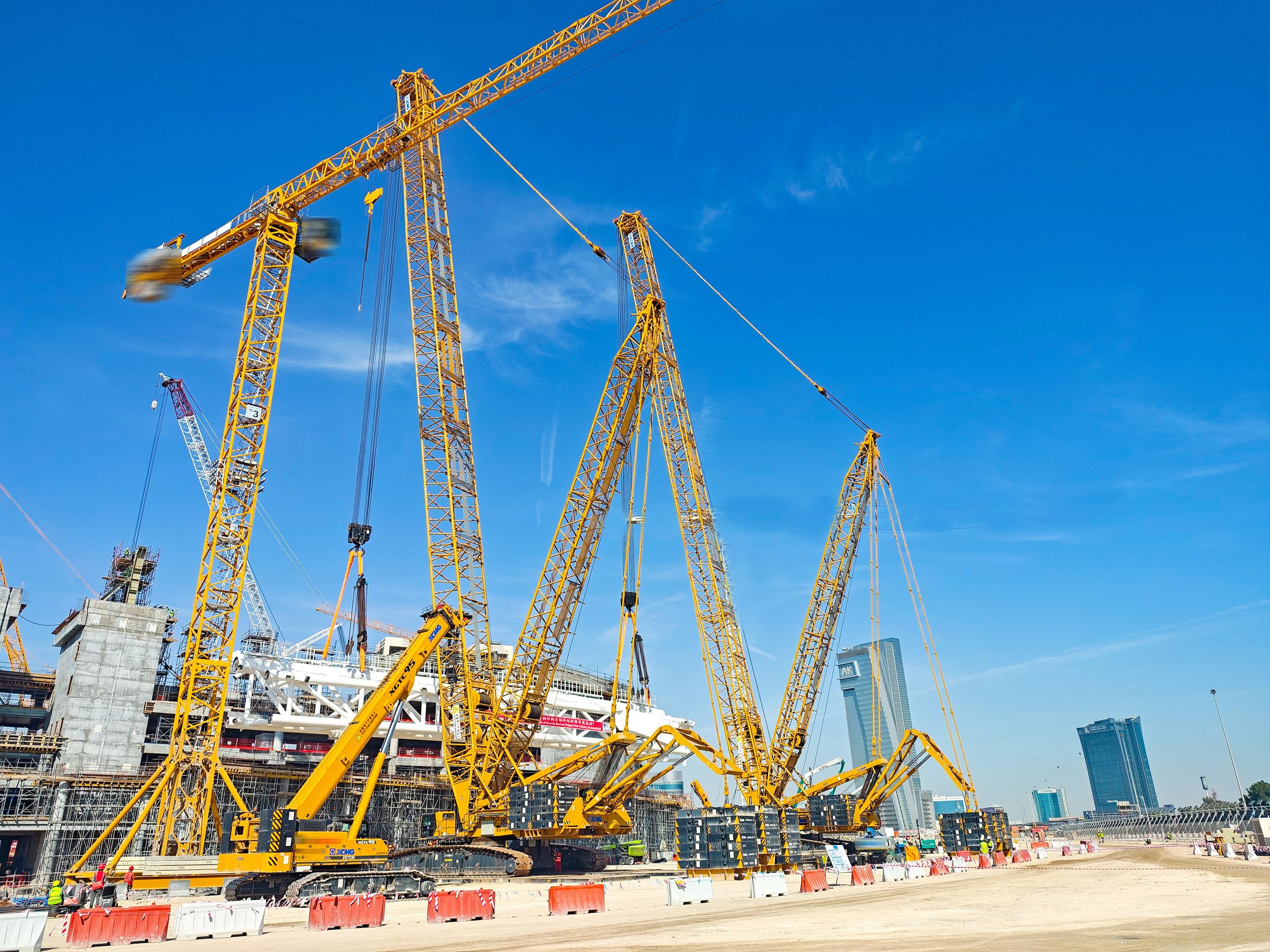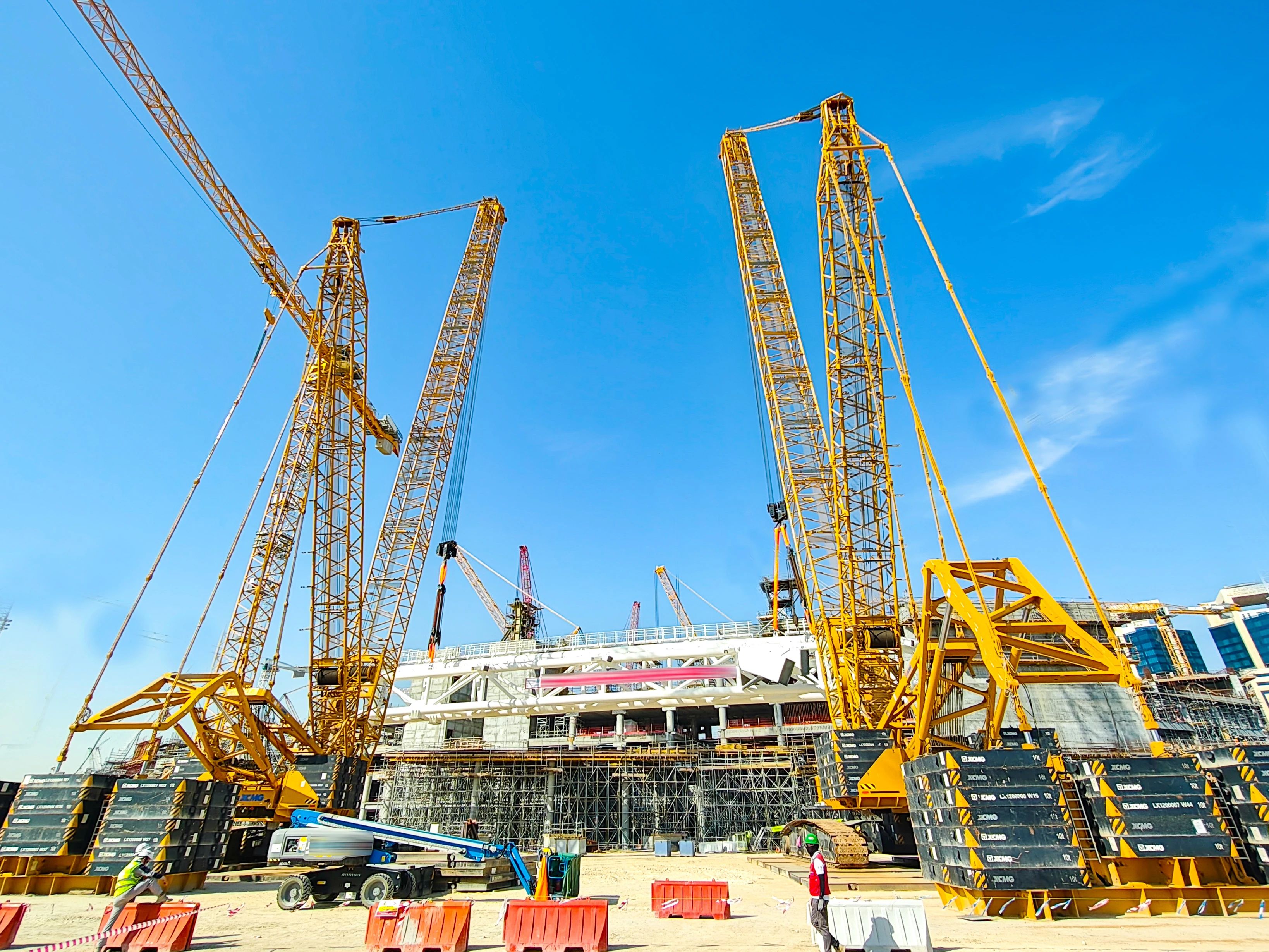 除了“双雄”,星空官方网页版起重机械全系产品也在项目大显神通。XGC400-I高效承担桁架拼装任务,XGC320批量完成看台骨架吊装作业,XGTC95、XGTC55等小吨位设备则灵活穿梭于场馆附属结构安装区域,助力项目节点高效完成。