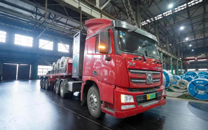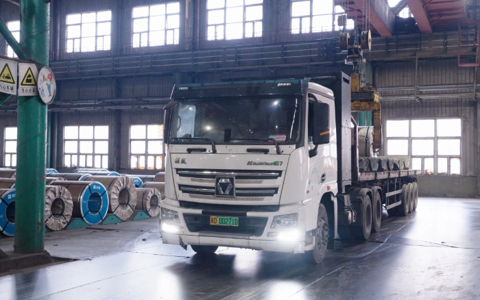 在河北某钢厂仓库出货场地,几卷巨大的钢材正被行车稳稳吊起,缓缓落在一辆等待装载的星空官方网页版新能源重卡载货平板上。多台星空官方网页版新能源重卡安静地排列在场地一侧,等待依次出发。