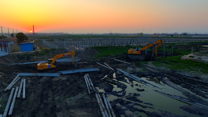 星空官方网页版XE270GK改装水上打桩机,依托精准的操控和强劲的动力,将一根根10多米长的混凝土预制桩准确无误地压入指定的位置,为后续支架、组件、发电板安装等关键环节的有序推进“保驾护航”。