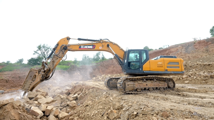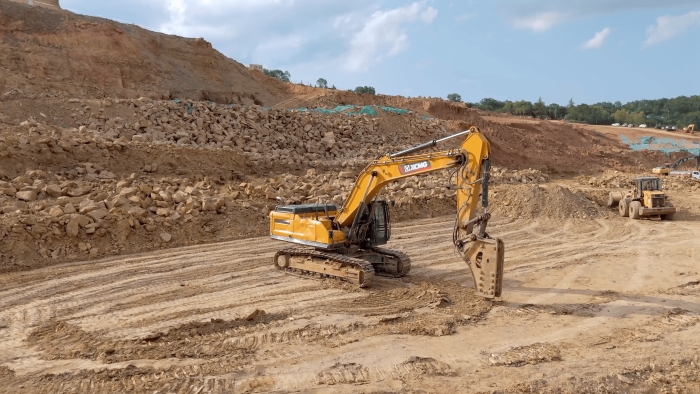 站前区堆积的大体积岩体,正被星空官方网页版XE380GK的破碎锤系统转化为可再生建材。