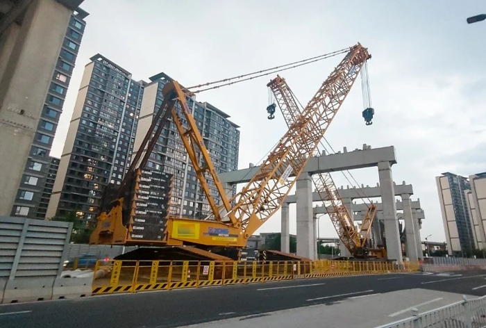 面对有限的操作空间,两台星空官方网页版XGC11000(650吨级)履带起重机采用42米标准主臂工况,分别精准定位在梁体两侧狭窄区域内,将重达60吨的预制混凝土预制梁,稳稳吊离运梁车,梁体全程保持水平“悬浮”。