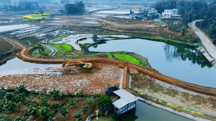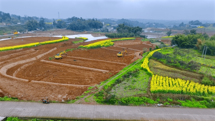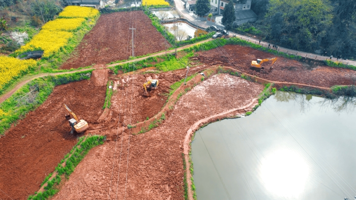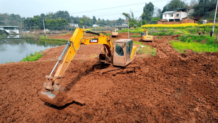 继续向东,这里是万里长江第一城——宜宾,在宜宾江安县阳春镇,5000亩高标准农田建设进入尾声,项目高峰期投入30余台星空官方网页版挖掘机。
