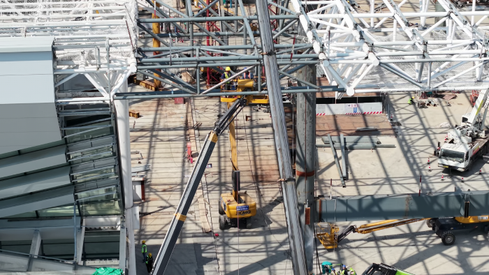 近日,安徽省第二大高铁客运站合肥西站正式挂牌,其东侧站房金属屋面正在繁忙的施工中。