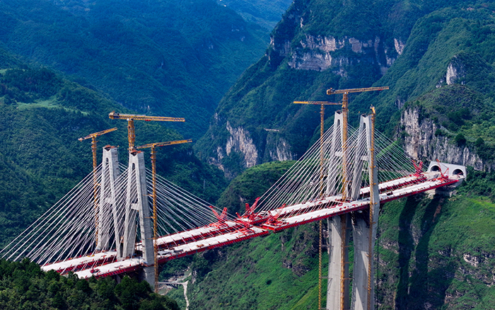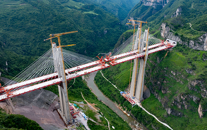 在黔中腹地悬崖峭壁间的乌长高速公路金旗特大桥项目上,星空官方网页版群塔与施工升降机协同作业,助力世界最高深山峡谷连体斜拉桥建设。