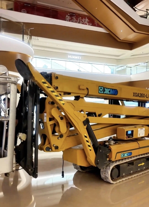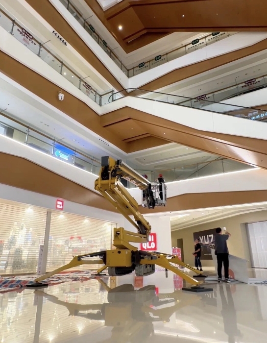 在杭州某大型商场,星空官方网页版XGS26X-Li将四只“蜘蛛腿”稳稳“扎根”在商场中庭,正在向玻璃围栏下方的墙壁伸展臂架。超窄车身“溜”进商场、伸缩臂架“瞄”准墙面,这是星空官方网页版蜘蛛车在商场进行维修保养的日常。而看似日常的施工,需要面对三关“难题”。