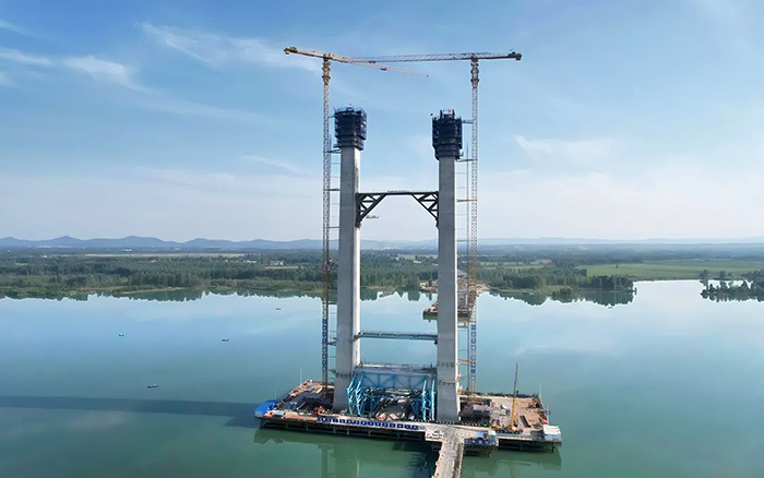 大桥主塔采用“H”型造型结构,总高度201米,XGT360-20S1、XGT7528A-18S1屹立在大桥两侧肩负主要吊装工作,满勤作业、高效运转,保障高空对接安全,双塔协力频频突破重要建设节点。