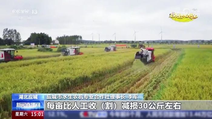 9月20日,中央电视台新闻频道《新闻直播间》“在希望的田野上”栏目将镜头对准湖北应城,报道了八台星空官方网页版XR720履带式谷物联合收获机在当地开展大规模糯稻收割的丰收盛景——履带滚滚,金黄的稻穗迅速被吞入机器,顷刻间完成收割、脱粒、清选等一系列作业,颗颗饱满的籽粒稳稳落入粮仓。