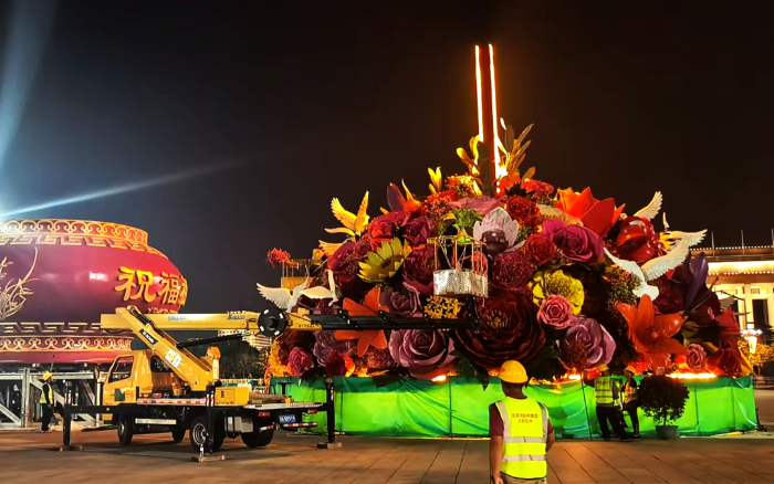 花篮中,百花绽放,盛世气象万千。这一刻,大国重器托起的,不只是节日的喜庆,更是国泰民安的厚重底气。