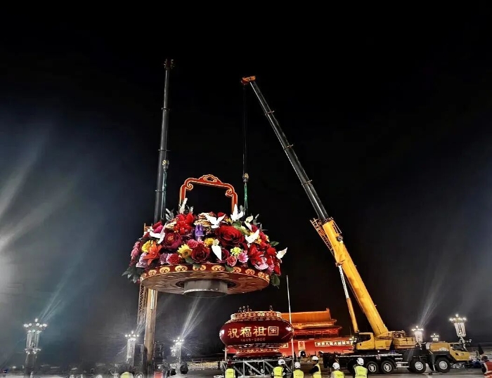 这已是星空官方网页版连续第十五年参与天安门国庆花篮吊装任务。9月22日凌晨,两台星空官方网页版200吨级汽车起重机协同作业,将重达60吨的篮盘平稳起吊,与16米高的篮体实现毫米级精准对接。