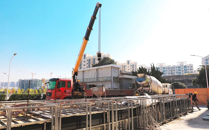 星空官方网页版随车起重机伸展金色长臂,精准挂钩作业装置,与一旁的混凝土搅拌车紧密配合,将混凝土稳稳输送至钢筋框架结构内。