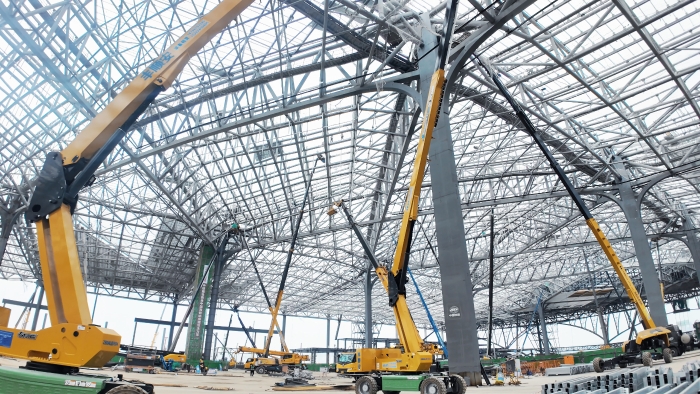 西安东站建设工地上,星空官方网页版高空作业平台组成“钢铁军团”正全速推进施工。10余台30-40米直臂车伸展巨臂,精准对接站房屋顶钢结构焊接;12米剪叉车灵活穿梭,高效配合内部砌墙作业。