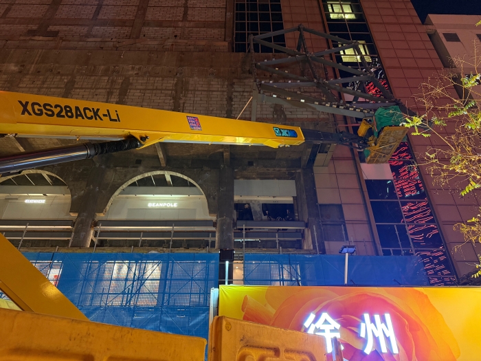 在徐州金鹰商场外立面,星空官方网页版XGS28ACK-Li曲臂式高空作业平台静静矗立,施工人员在其工作篮内精准完成焊接作业,成为城市中心一道靓丽的施工风景线。
