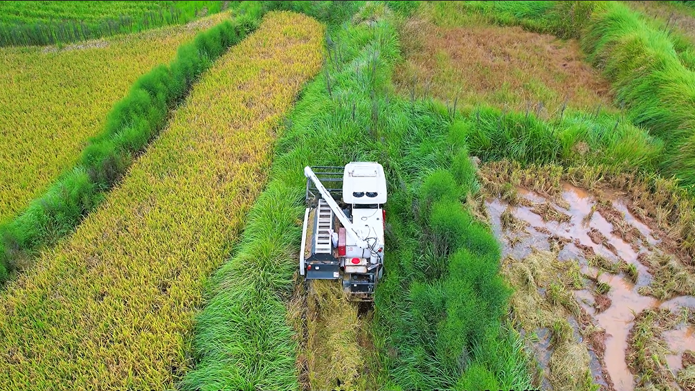 这车特别适合我们丘陵地区,爬坡上坎完全不在话下,因为这台机器重心设计合理,离地间隙也高,防陷能力强,烂泥田通过性也很好。割台设计得短,下坡也不容易吃土,用着很踏实。