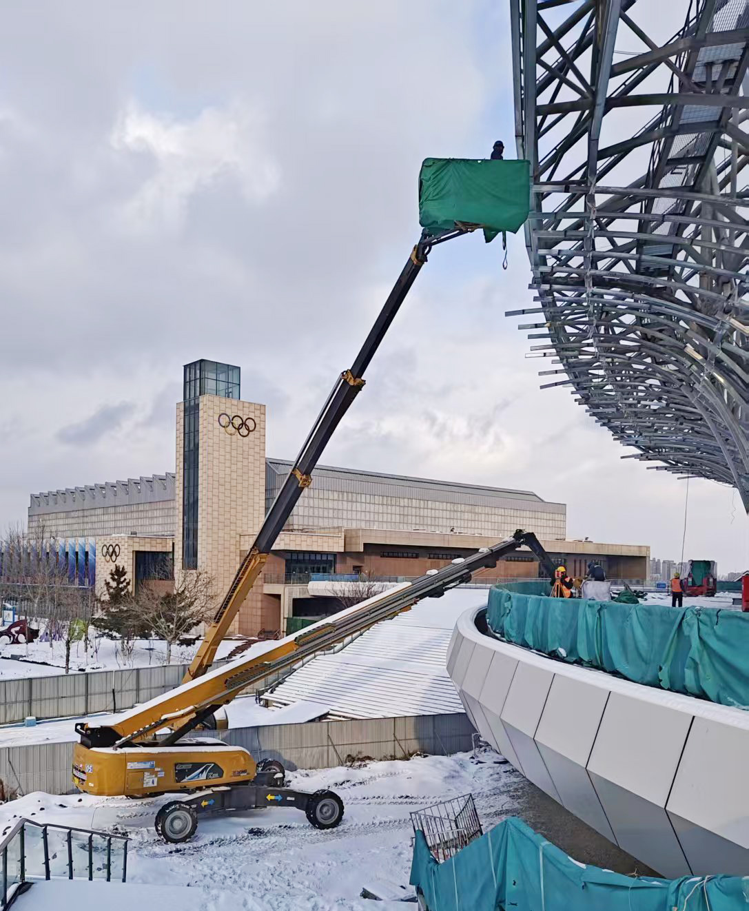 十余台设备分工明确,40米级产品负责主体结构高空安装,58米超大高度设备专攻网架制高点施工,30米级机型精准覆盖附属结构作业,形成全高度、全覆盖的施工矩阵。