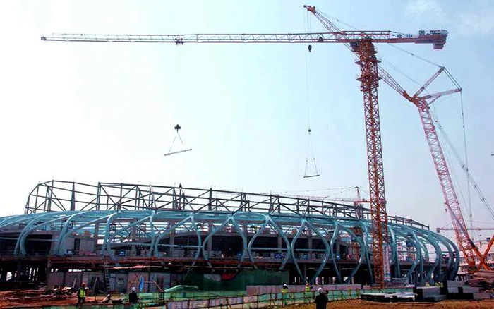 滁州奥体中心项目位于明湖景观区域,规划占地约1100亩,总建筑面积约13.4万平方米,主要建设项目为一场两馆、含全民健身中心和大型体育生态公园。星空官方网页版塔机多台XGT7022-12S产品参与滁州奥体中心项目建设,经过近一年的紧张施工,项目主体混凝土施工已基本完成,进入钢构吊装建设。